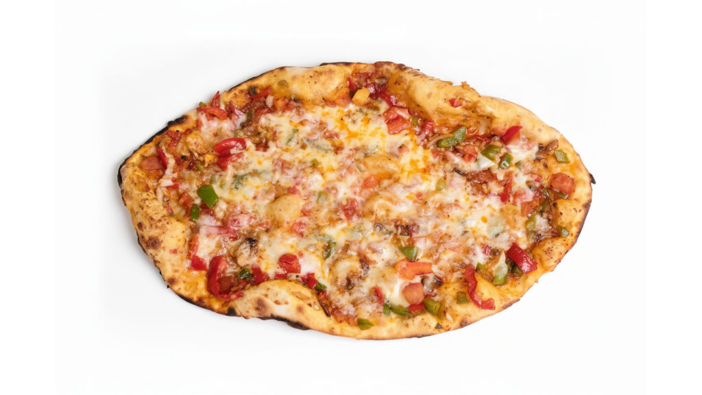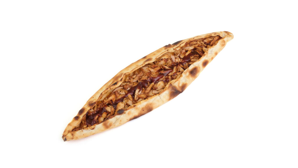 Marinated & barbecued chicken on a medium crust Turkish style pizza