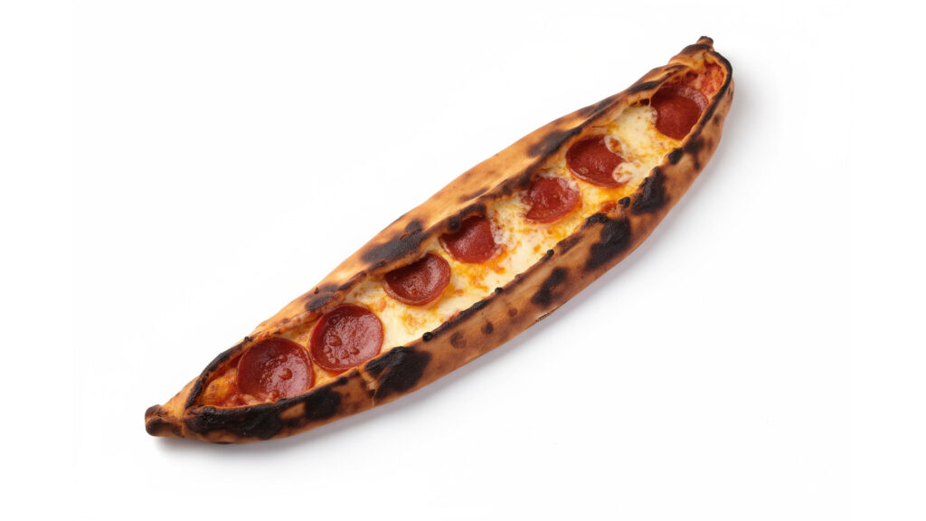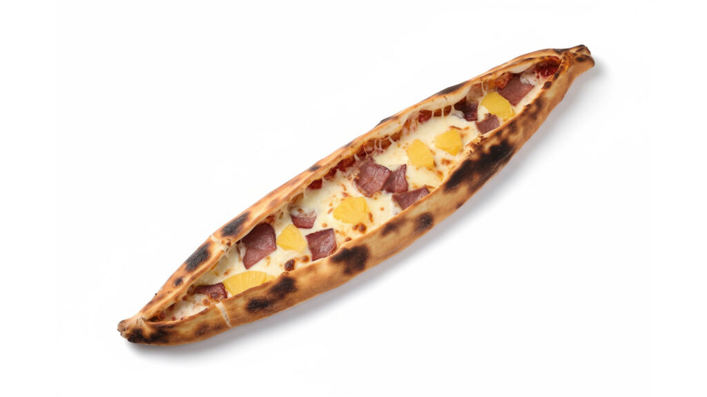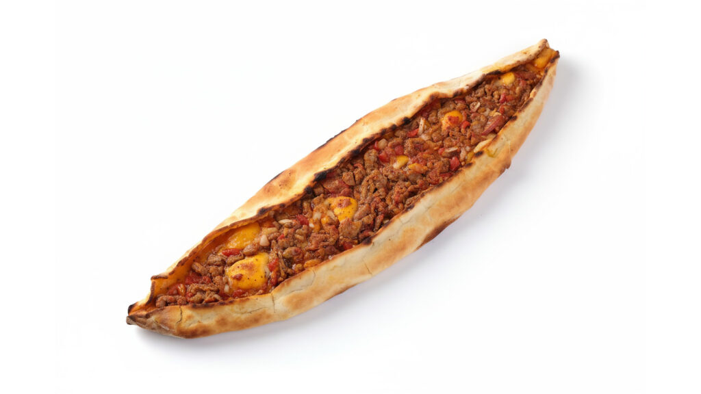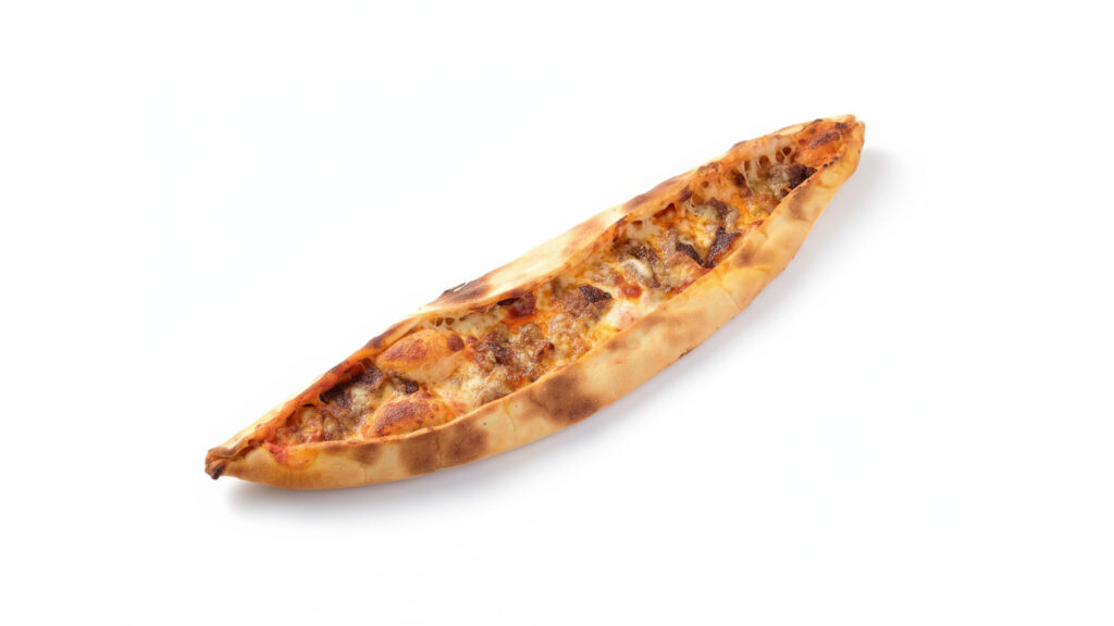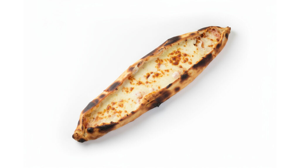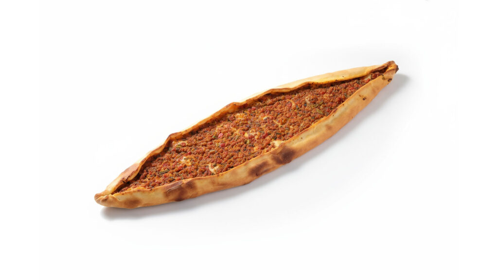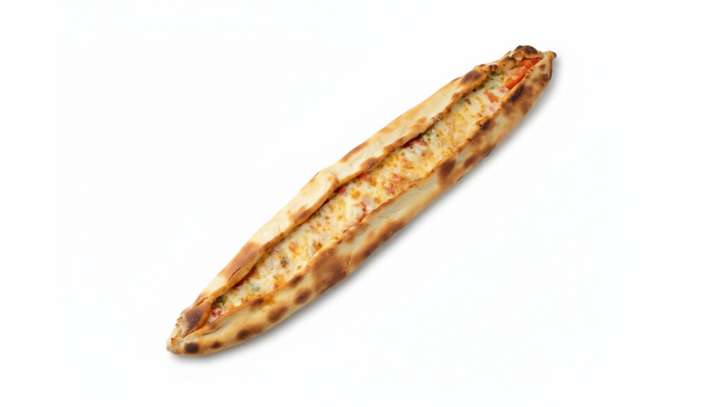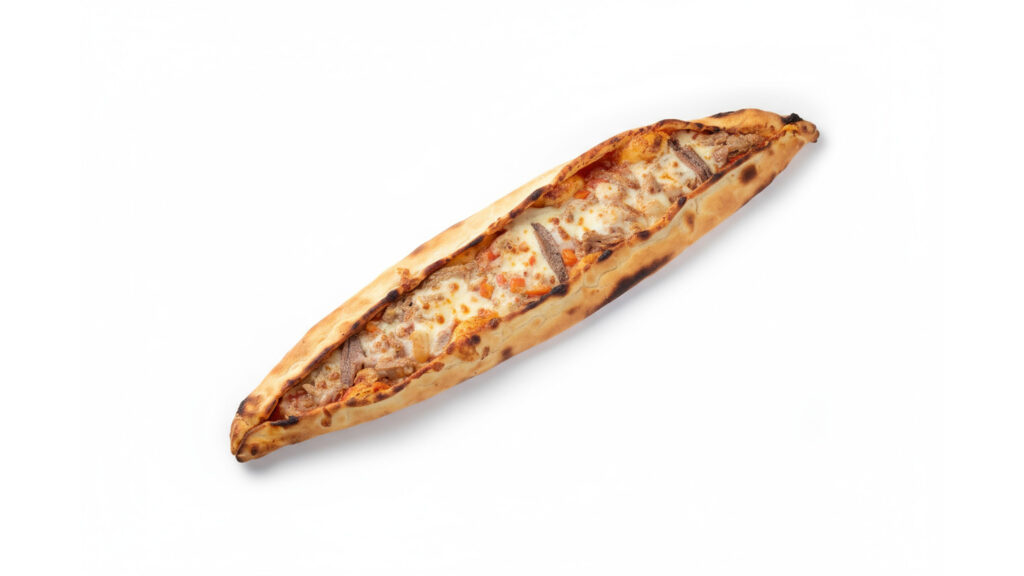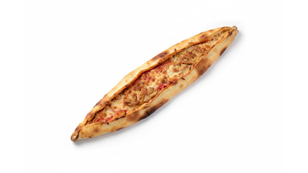 Tomato base and melted cheese on a medium crust Turkish style pizza